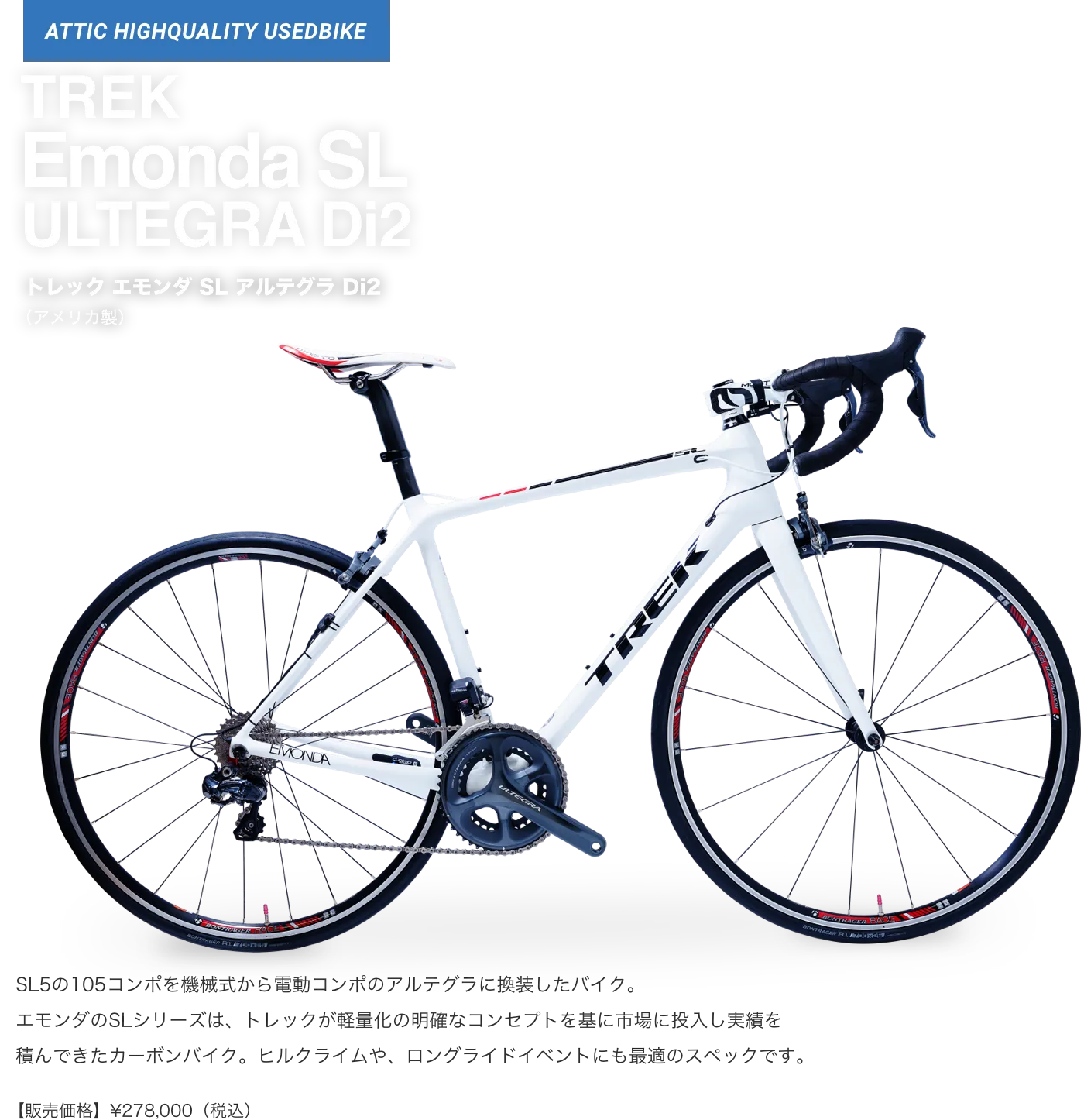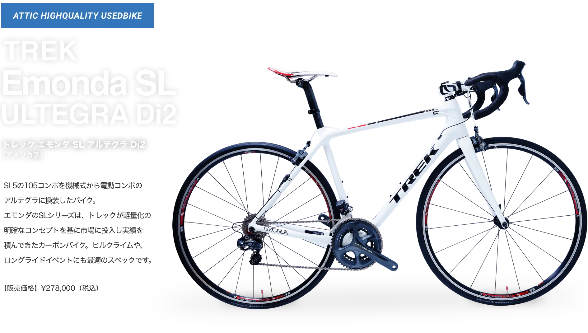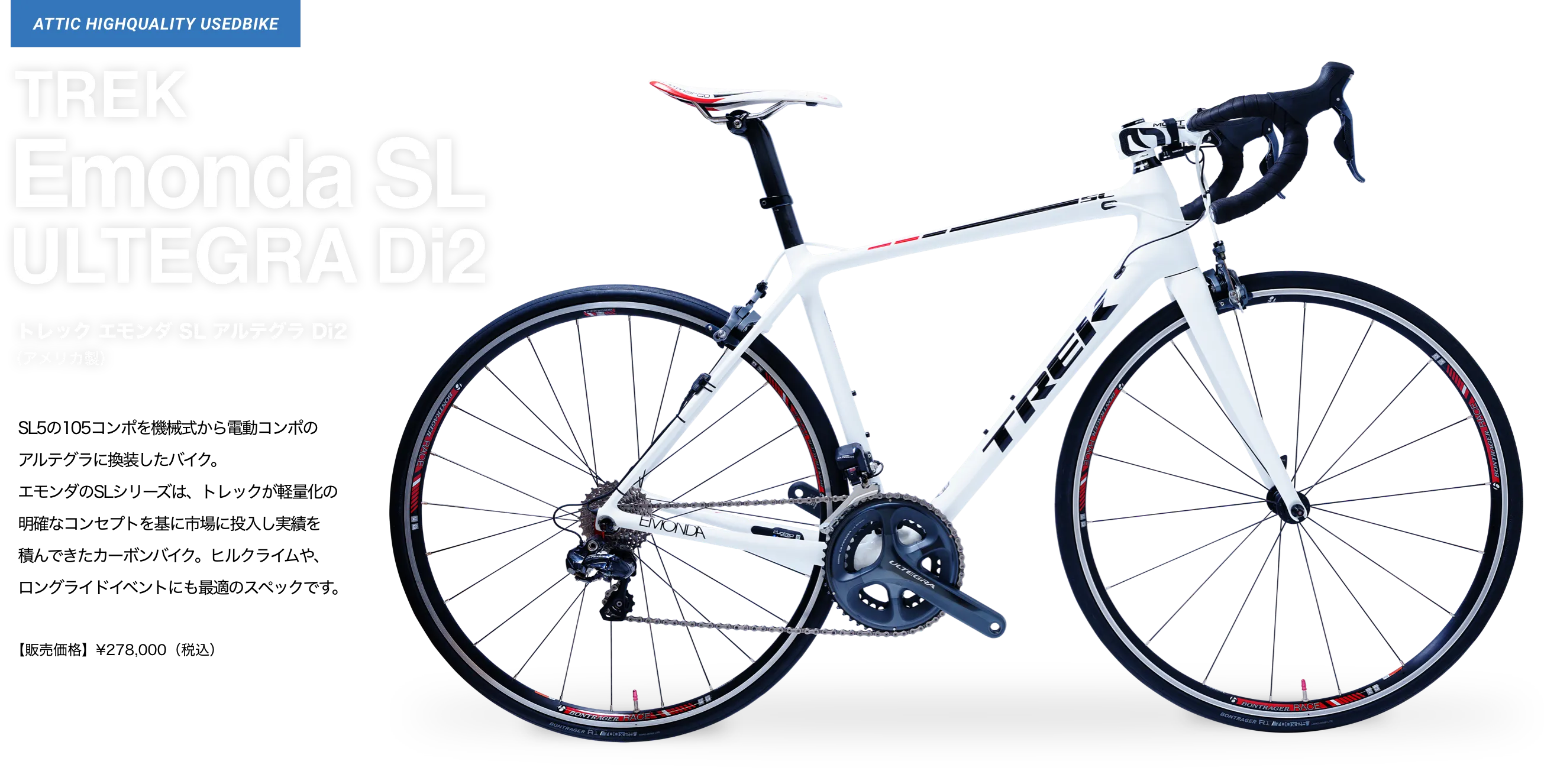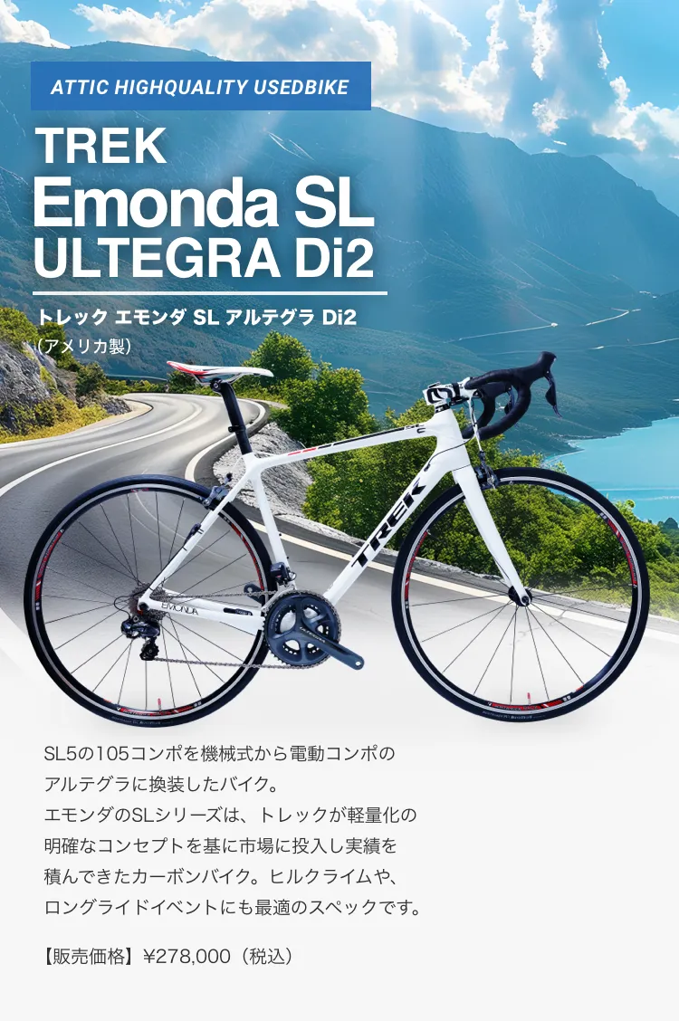 アティックでは、お客様が大切に愛用されていたロードバイクを厳選して買取り、元レーサーの店長自らが整備して、アティック整備車としてご提供しています。取扱いは人気メーカーから希少メーカーまで、日本製・海外製を問わず、中古車のためすべて一点物のラインナップとなります。