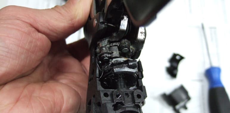 しかも、なぜかユニット内に大量の潤滑剤が。こんなに汚れていると、別のトラブルを引き起こすかもしれません。ユニット内で汚れた砂とか噛んだらレバーの動きに支障が出てしまうかも。
