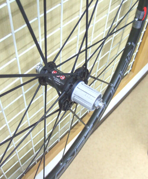 ほとんど使用感の感じられないFULCRUMのレーシングゼロ カーボンホイール。鉛のテープを貼ってホイールバランスを微調整しているレーシングフィールのホイールです。
